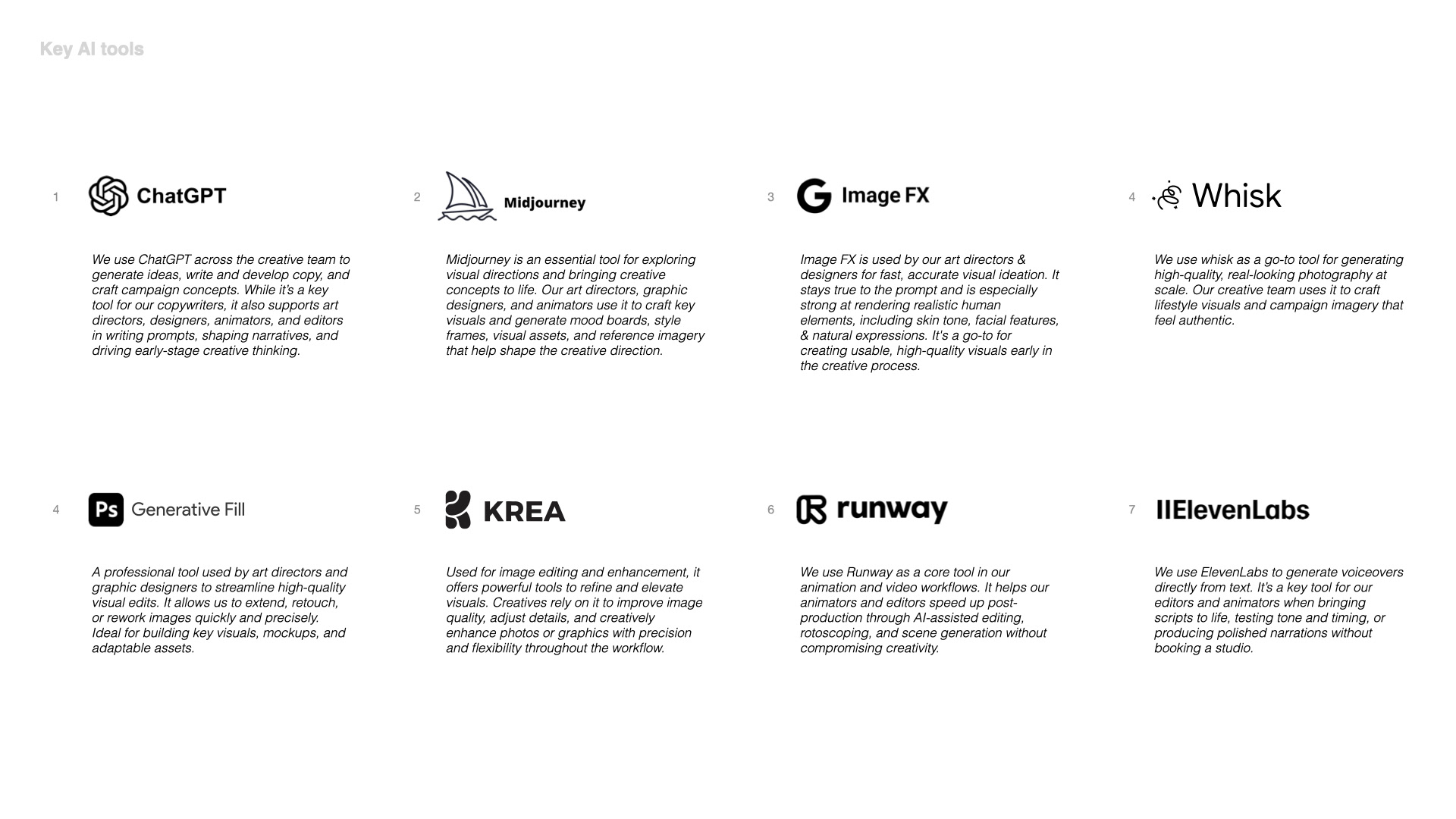 This project explores how multiple AI creative tools work together to produce cohesive, high-quality results, whether static or animated. Flows guide the process through iteration, refinement, and experimentation. Each flow is driven by a core tool, while additional tools enhance and adjust outputs. Human input adds final touches, customizing details and achieving subtle improvements beyond automated generation. The process also shows how prompts evolve and are built from key elements such as specific words to shape composition and style. It demonstrates how complex results can be achieved by combining references and guided adjustments across multiple tools.