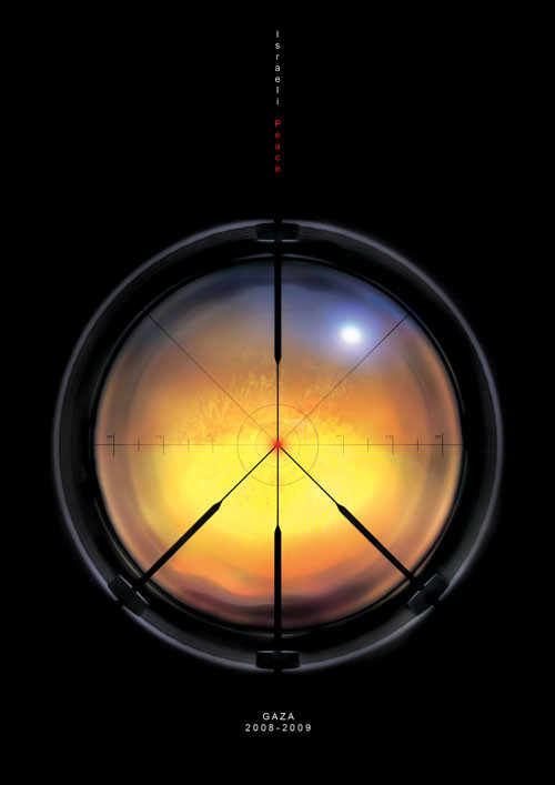 This poster show the way Israel imagines peace. The poster indicate a visual combination between two visual objects the sniper crosshair and the international peace sign.