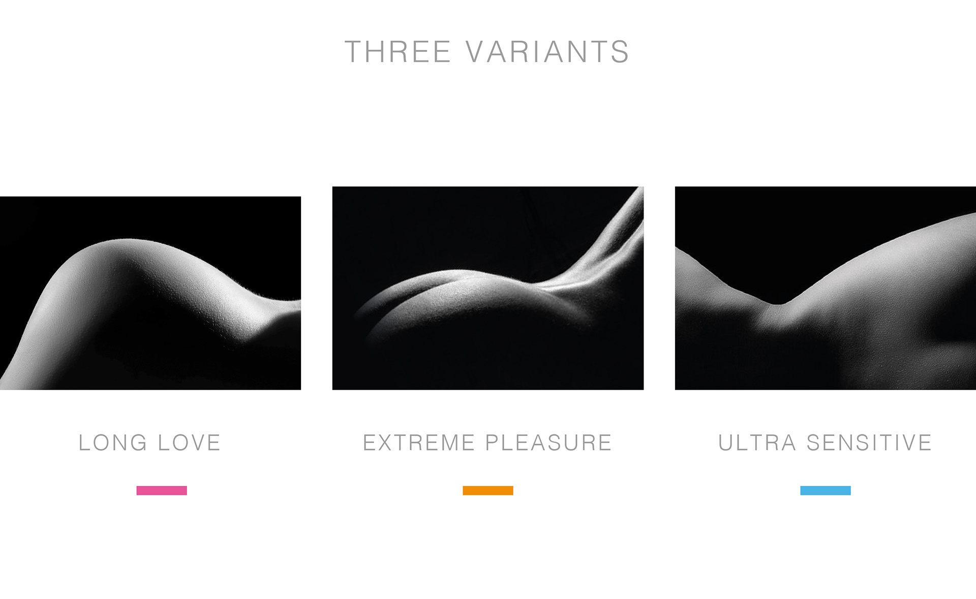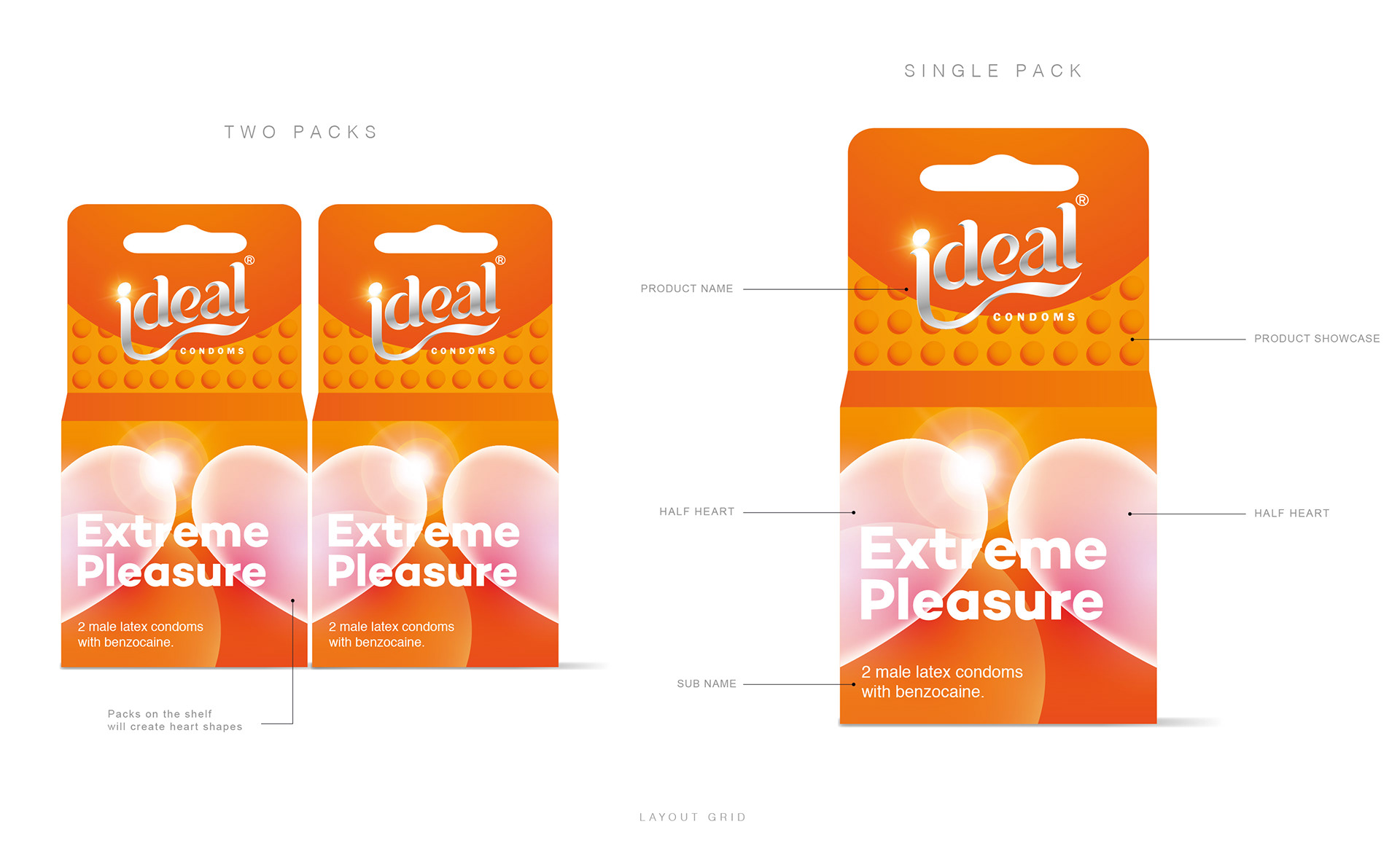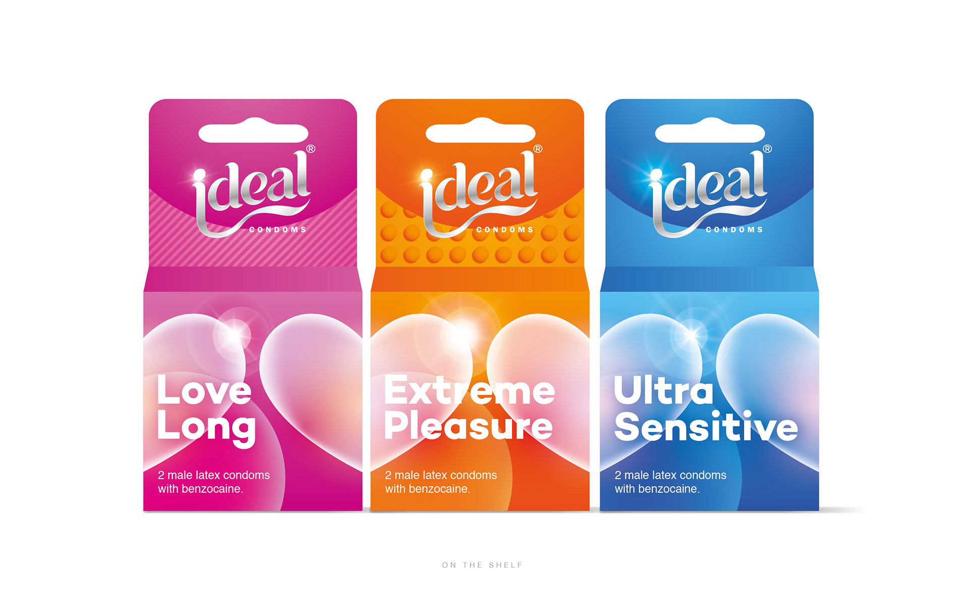 Two concepts for condoms packaging with three variants Ultra sensitive, Extra Dotted and Long Love.