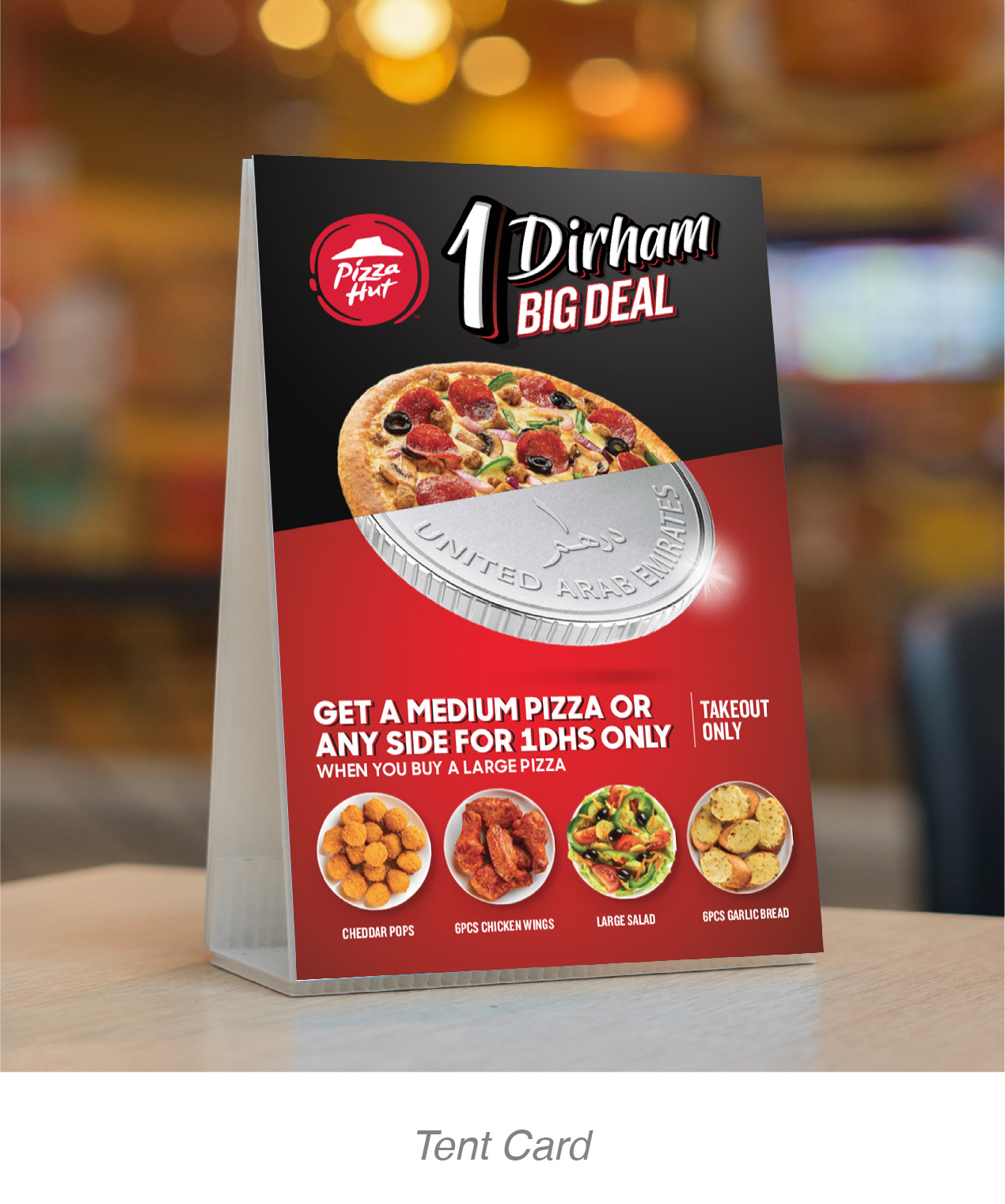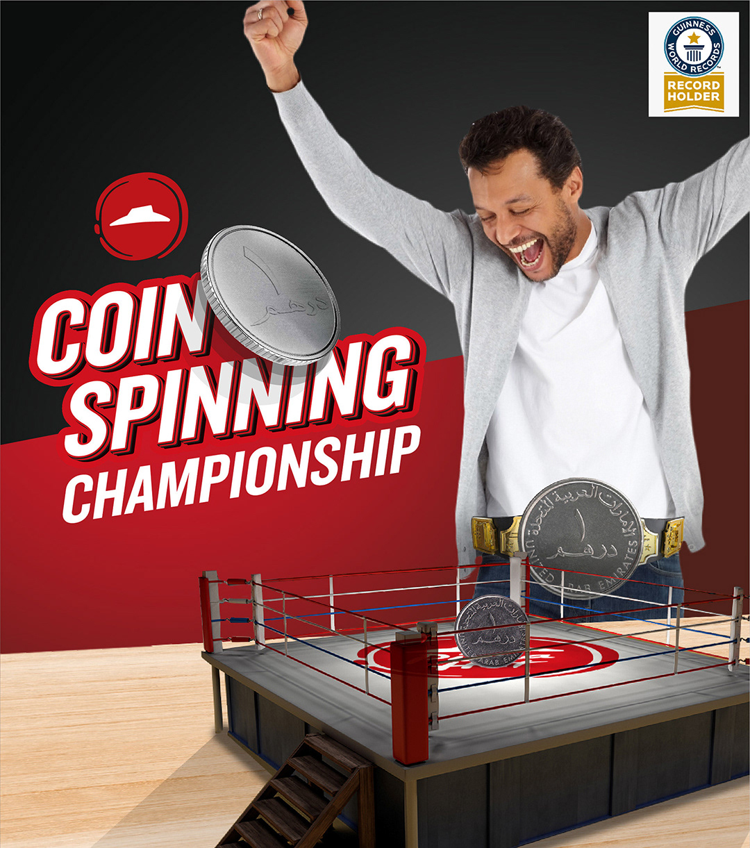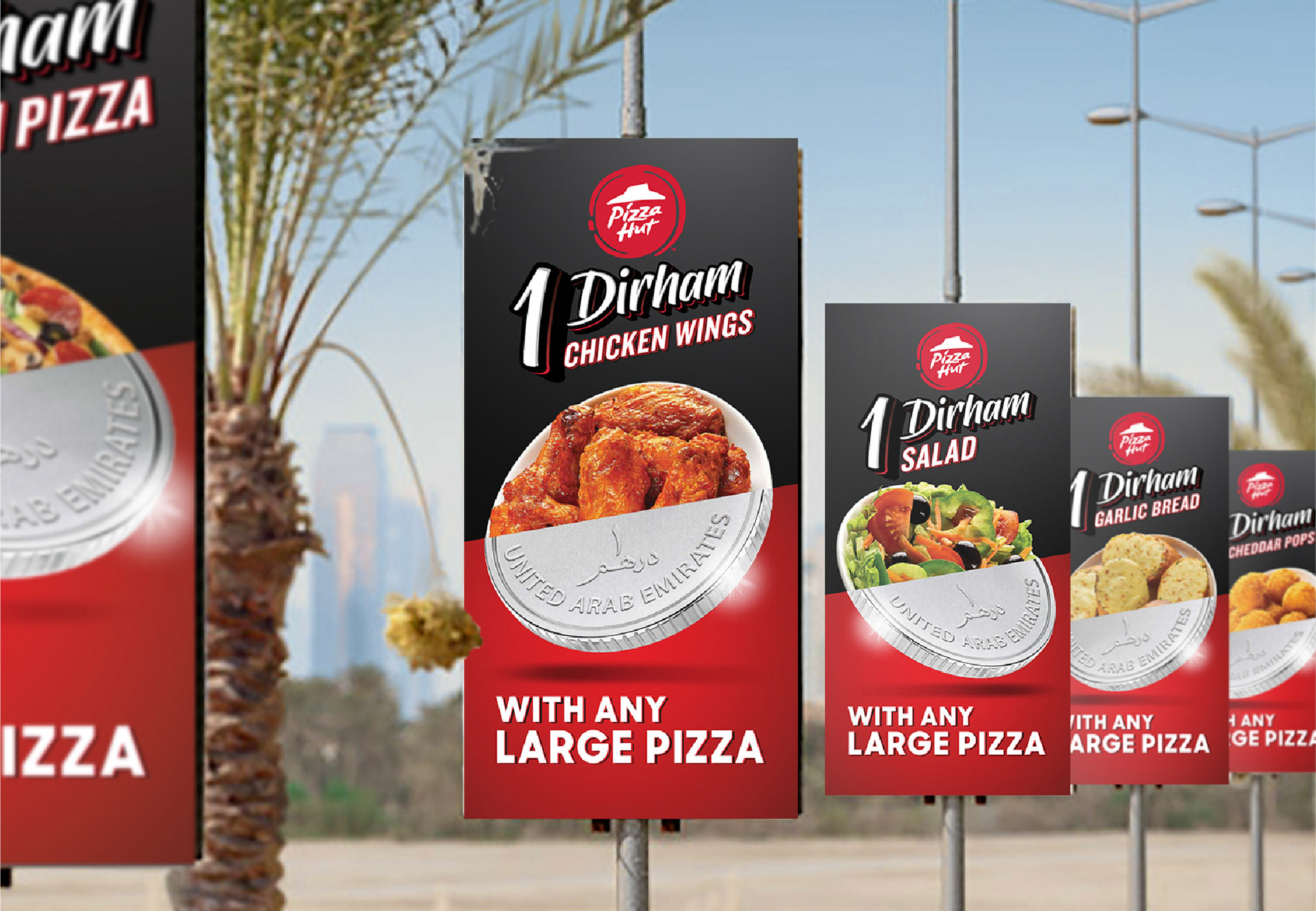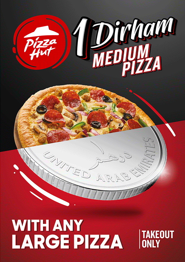 Using the spinning coin as our central visual element, we are splitting the elliptical shape of the coin to show the various sides you get with only 1 dirham (when you buy any large pizza). The visual is very dynamic and can easily be adapted to accommodate any of the sides (included in the offer).