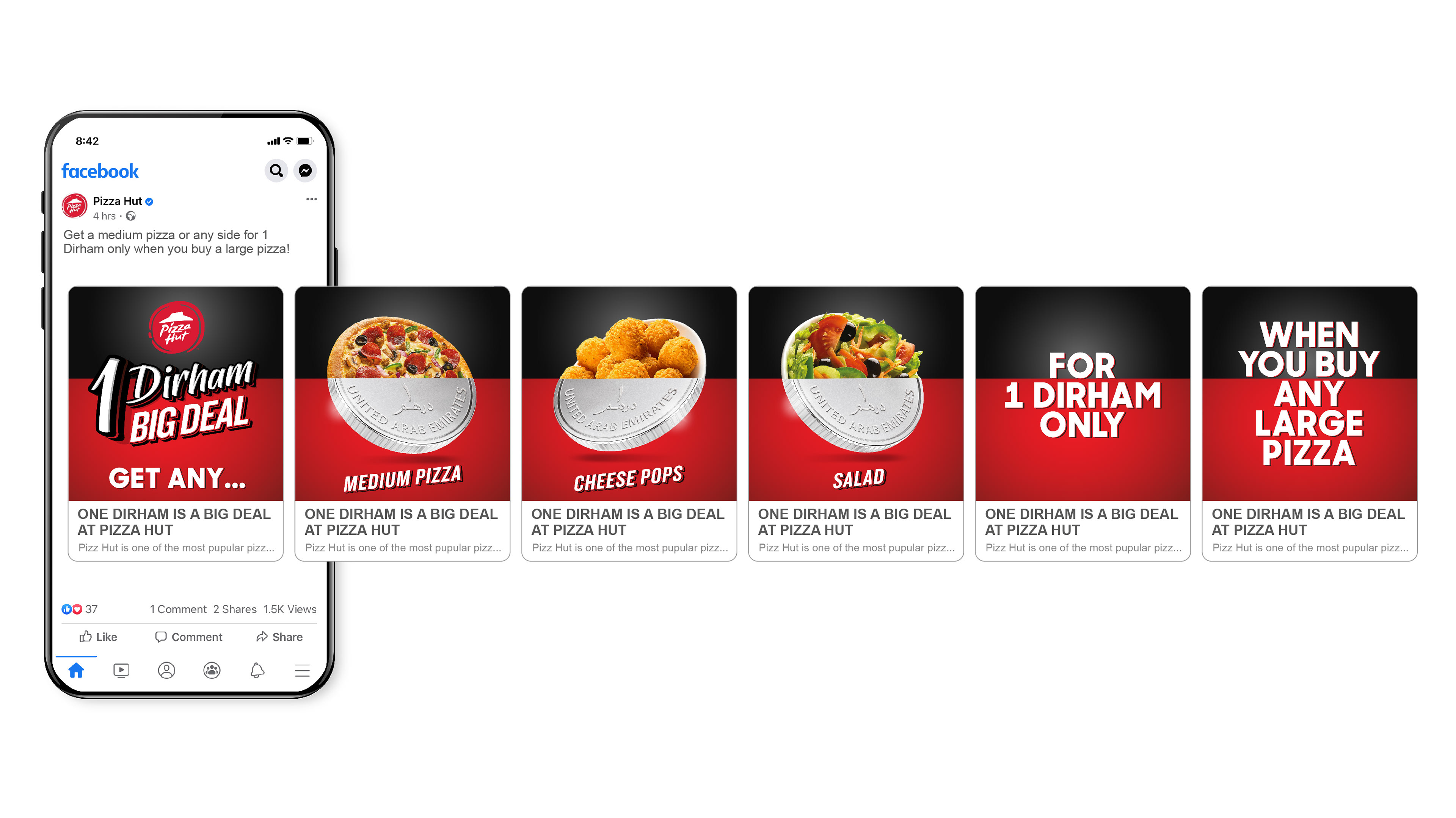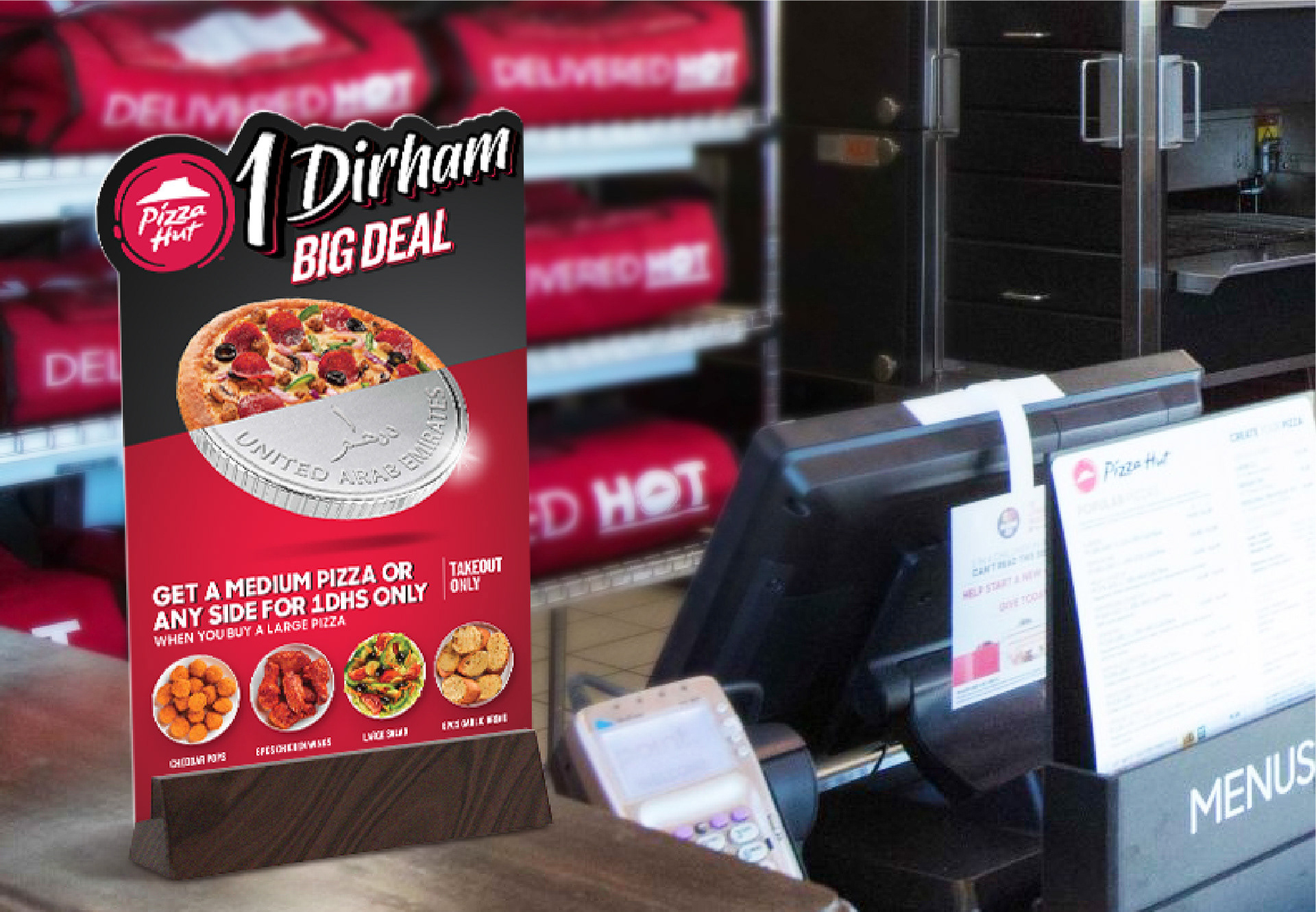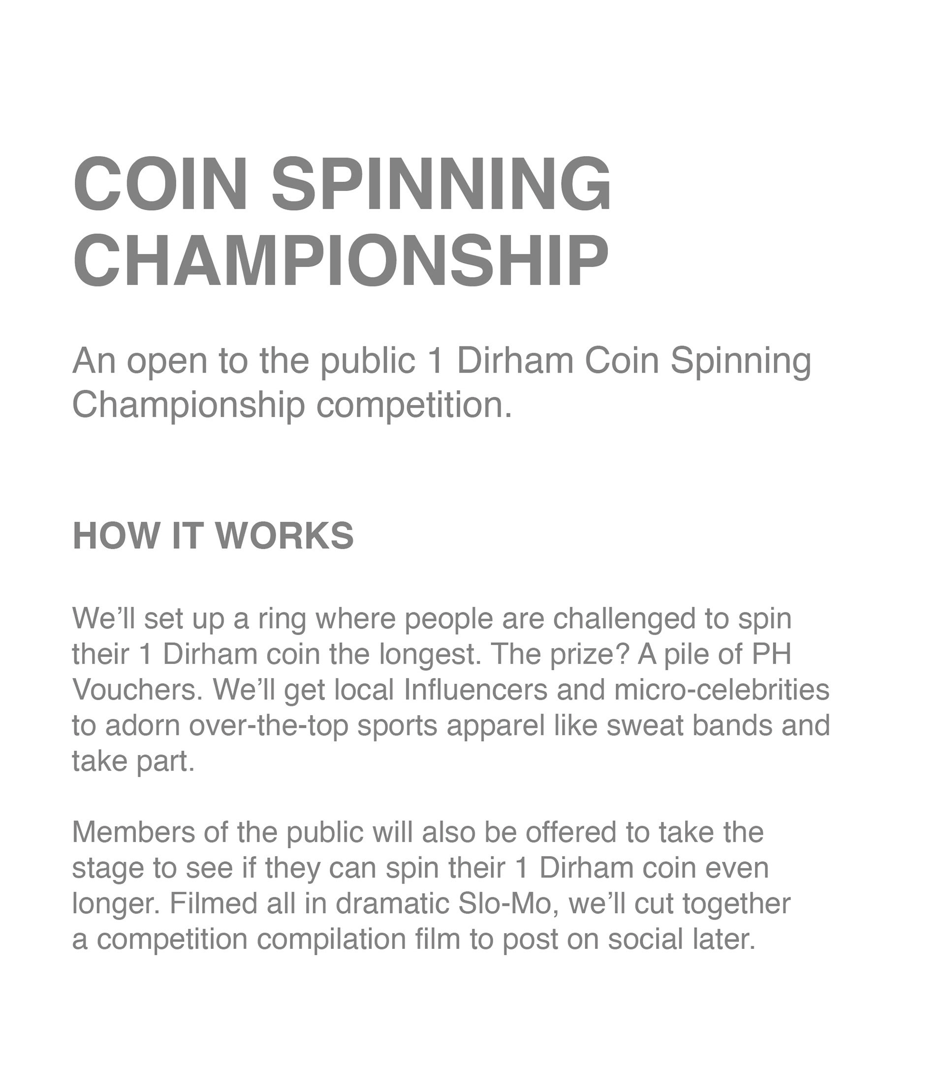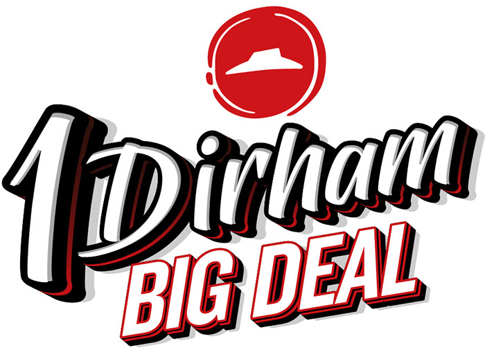 Using the spinning coin as our central visual element, we are splitting the elliptical shape of the coin to show the various sides you get with only 1 dirham (when you buy any large pizza). The visual is very dynamic and can easily be adapted to accommodate any of the sides (included in the offer).