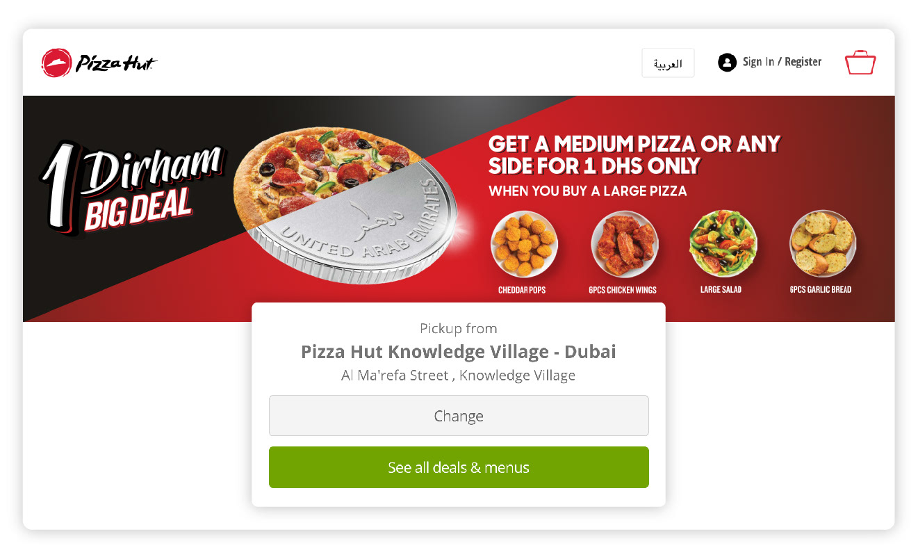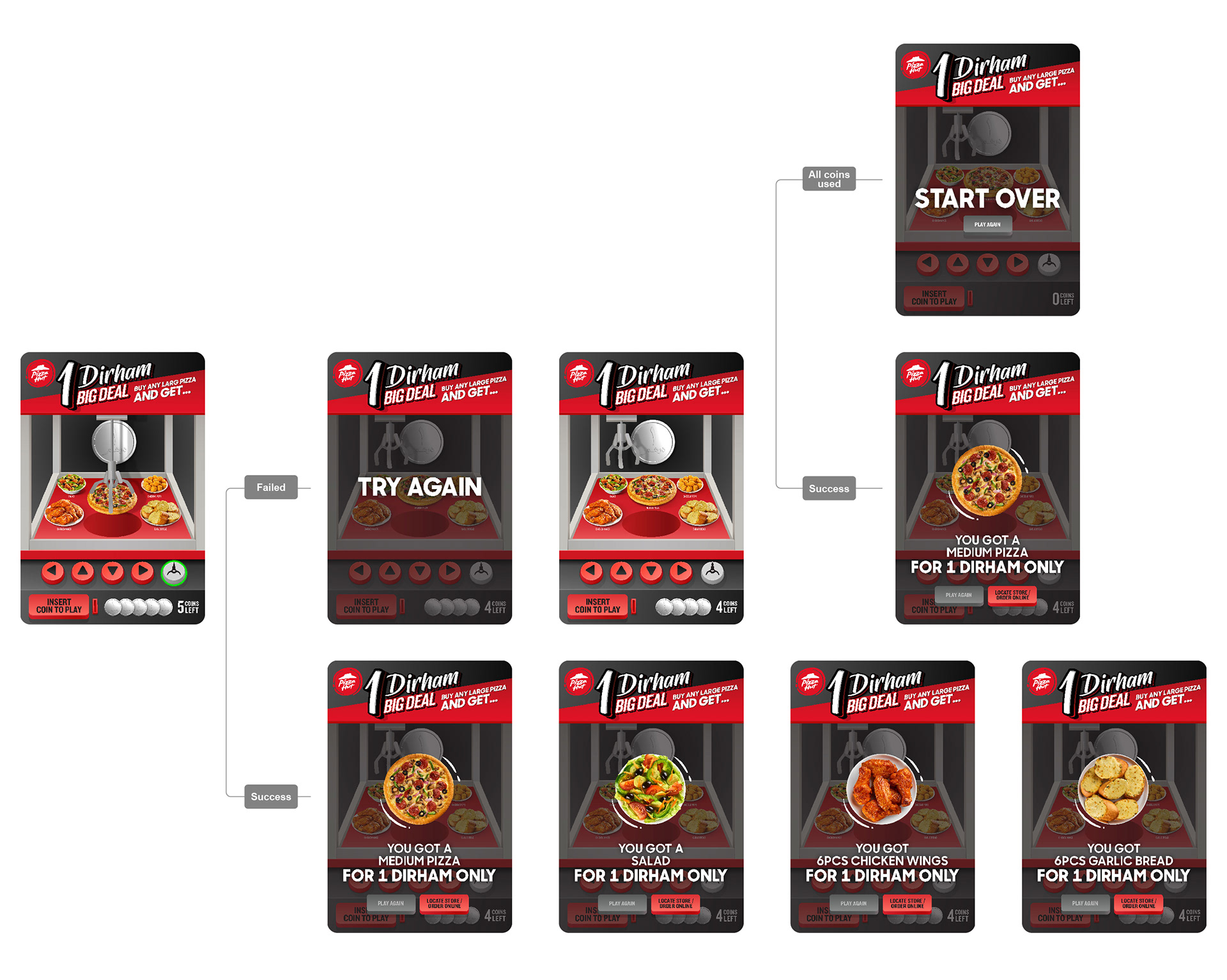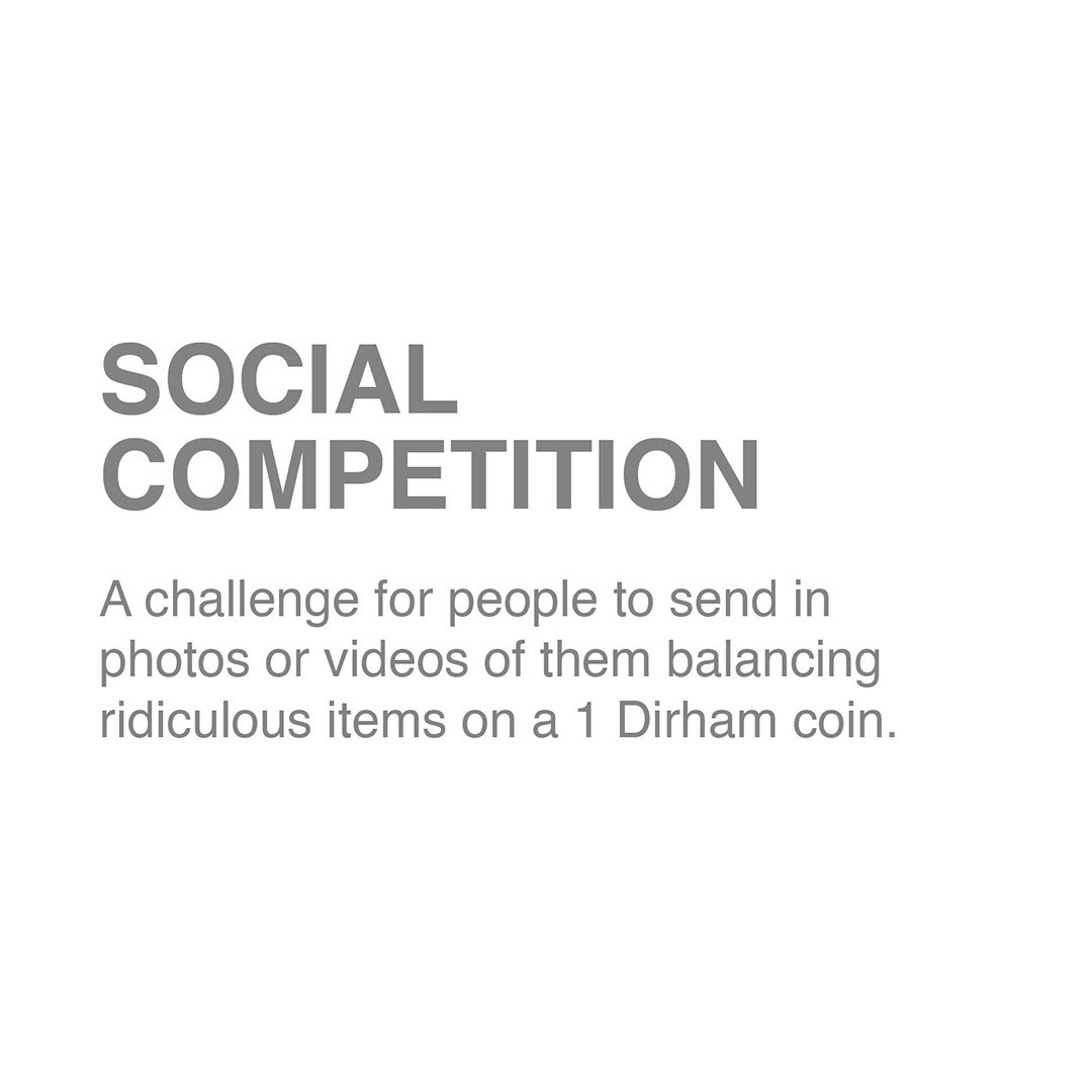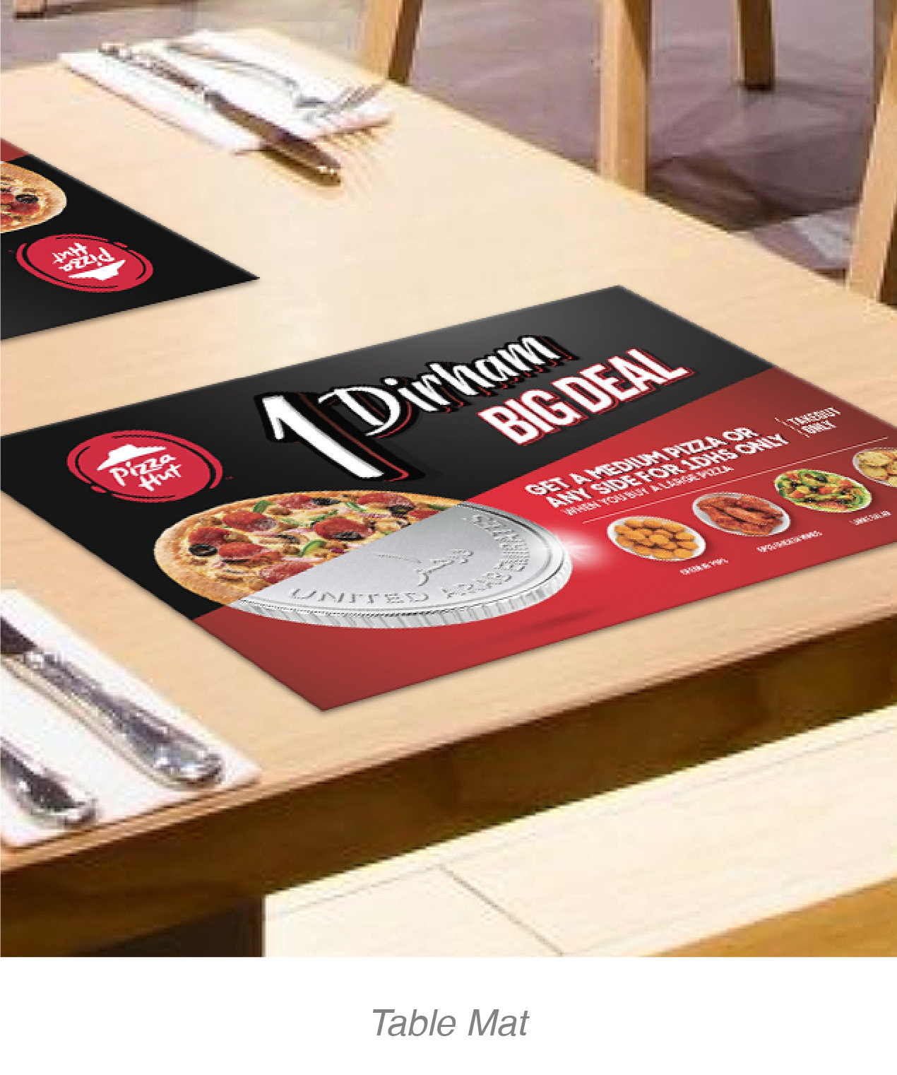 Using the spinning coin as our central visual element, we are splitting the elliptical shape of the coin to show the various sides you get with only 1 dirham (when you buy any large pizza). The visual is very dynamic and can easily be adapted to accommodate any of the sides (included in the offer).